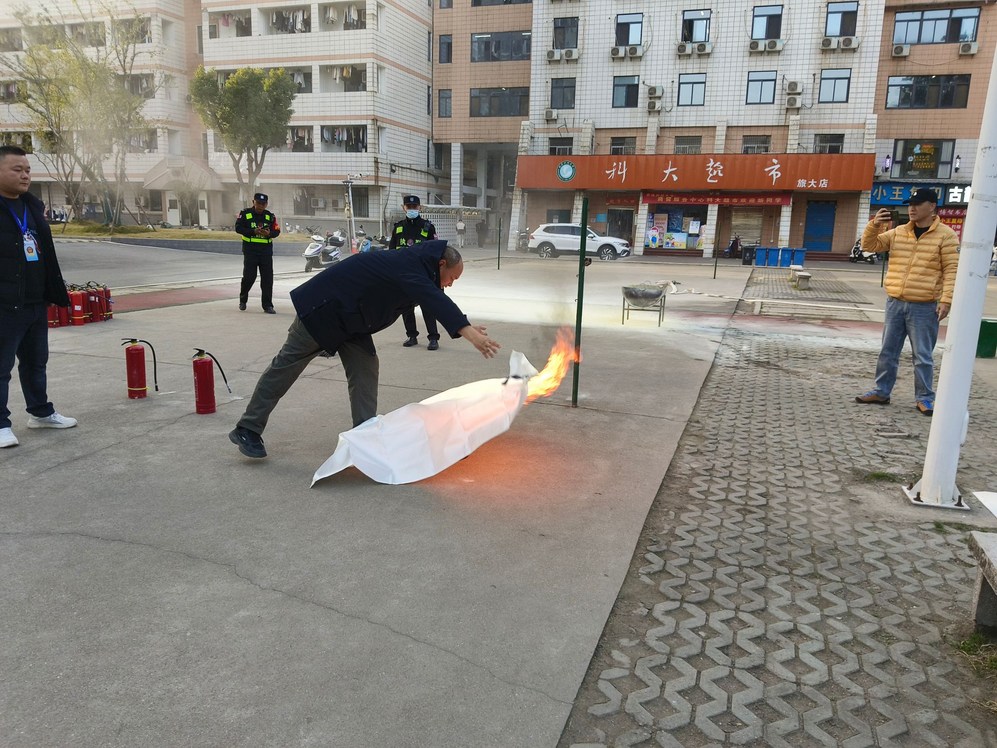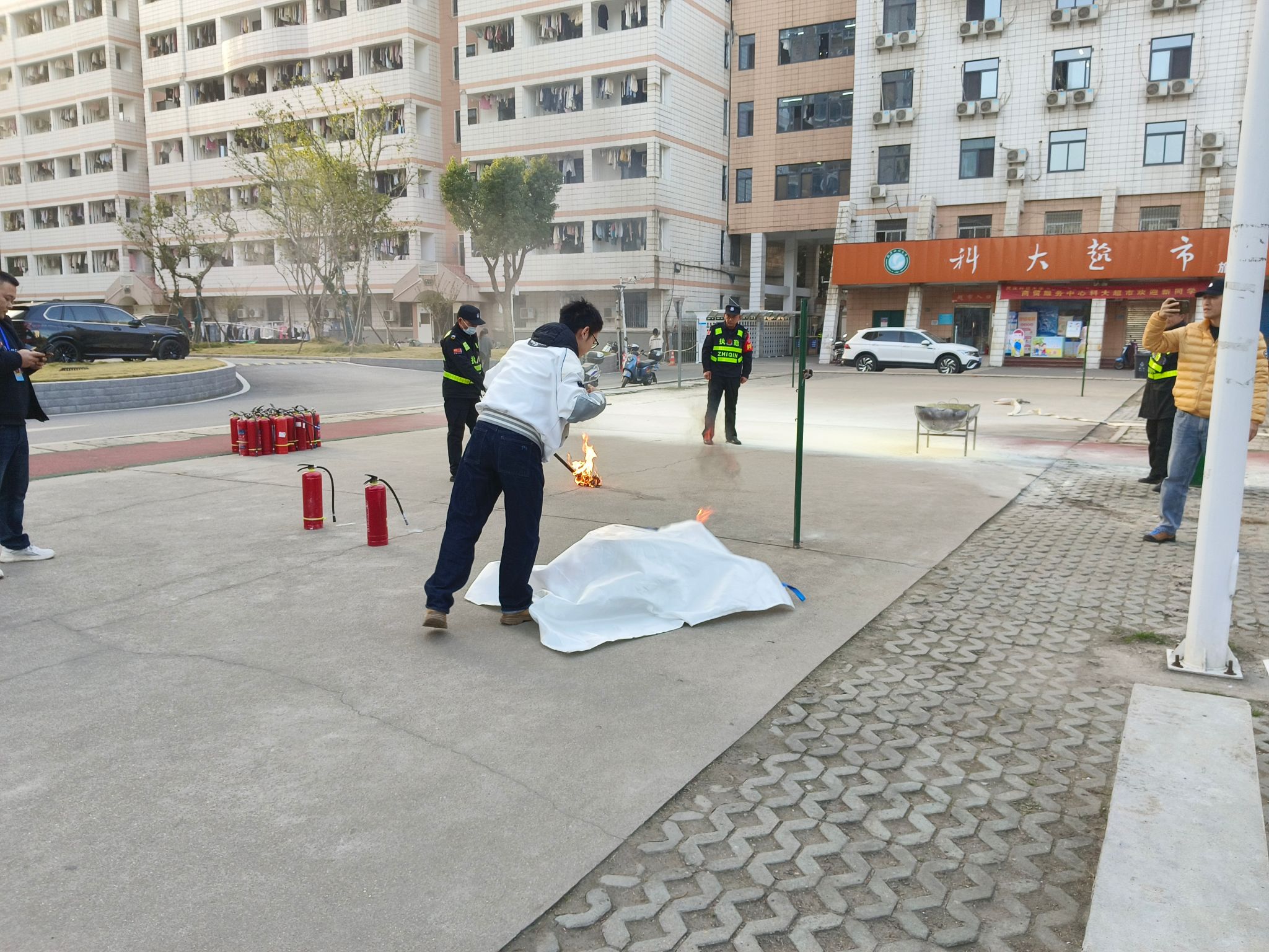 疏散集结完毕后,师生们移步至消防演练区,进入演练的第二阶段——消防器材实操培训。保卫处专业人员详细讲解并演示了干粉灭火器的正确使用方法,精炼概括为“提、拔、握、压”四个步骤,并辅以“提拔我呀”的谐音梗帮助记忆,生动形象。在随后进行的实操环节中,师生们积极参与,两人一组,提着灭火器,轮番上阵,面对点燃的油桶火焰,沉着冷静地按照操作要领成功将火扑灭,亲身体验了初期火灾的扑救过程。