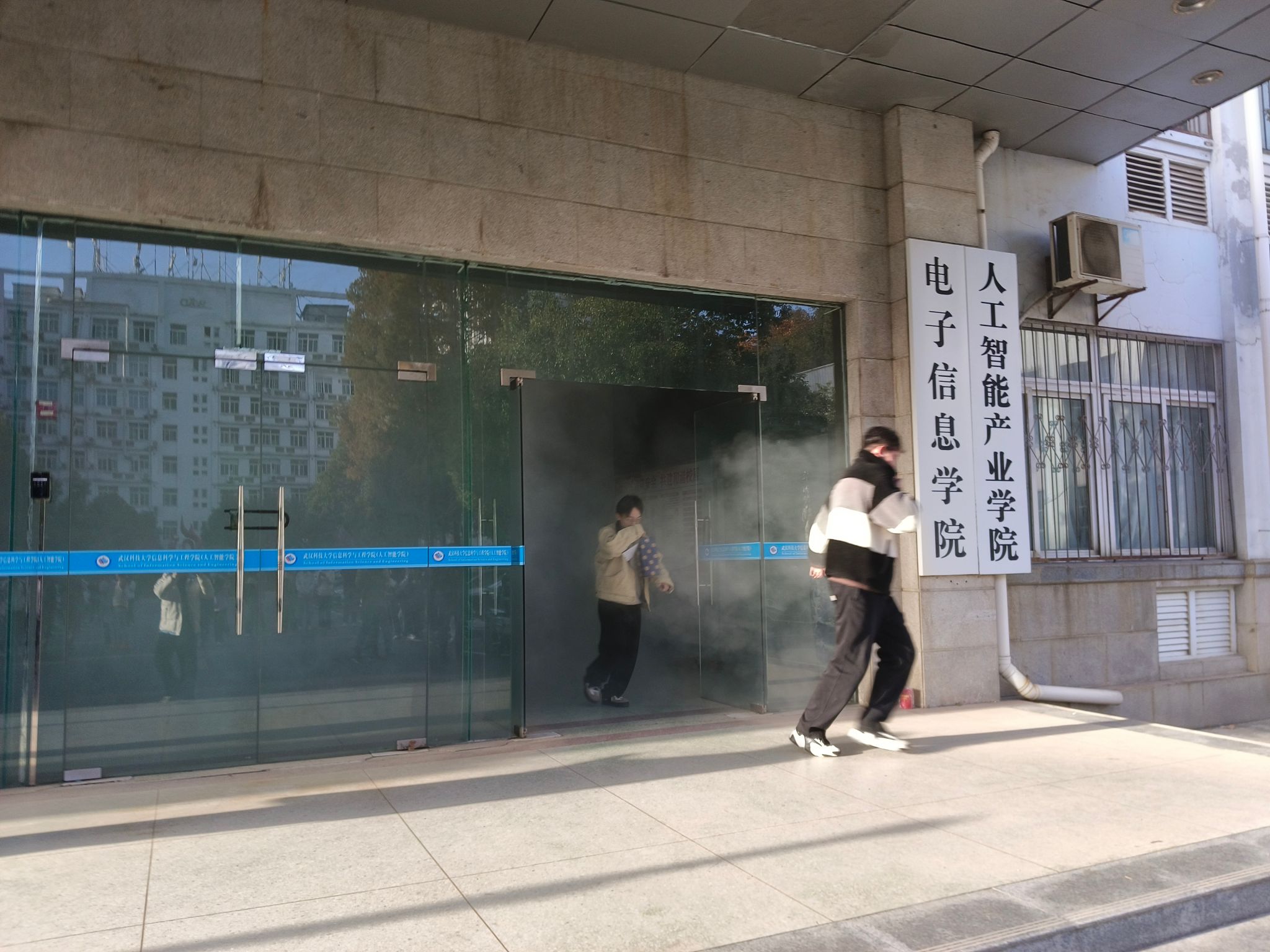 演练第一阶段模拟了真实火情下的应急疏散。保卫处在教学楼一楼释放了无毒无害的模拟烟雾,烟雾迅速沿楼梯间向上蔓延,很快,灰色烟雾弥漫于各楼层通道,现场能见度降低,蜂鸣警报器持续鸣响,营造出逼真的火险环境。警报响起后,全院师生反应迅速,立即中断手头工作,严格按照应急疏散预案,在视线受阻的情况下,依然保持冷静,行动有条不紊,沿着安全通道快速撤离。整个疏散过程高效、顺畅,仅用时不到4分钟,所有师生均已安全转移至教学楼前指定集结区域,顺利完成疏散工作。一位参与演练的研究生说:“虽然知道是演练,但当烟雾弥漫、看不清前路时,内心依然紧张。这种‘实战’体验,比任何口头说教都更让人深刻理解保持冷静和熟悉逃生路线的重要性。”