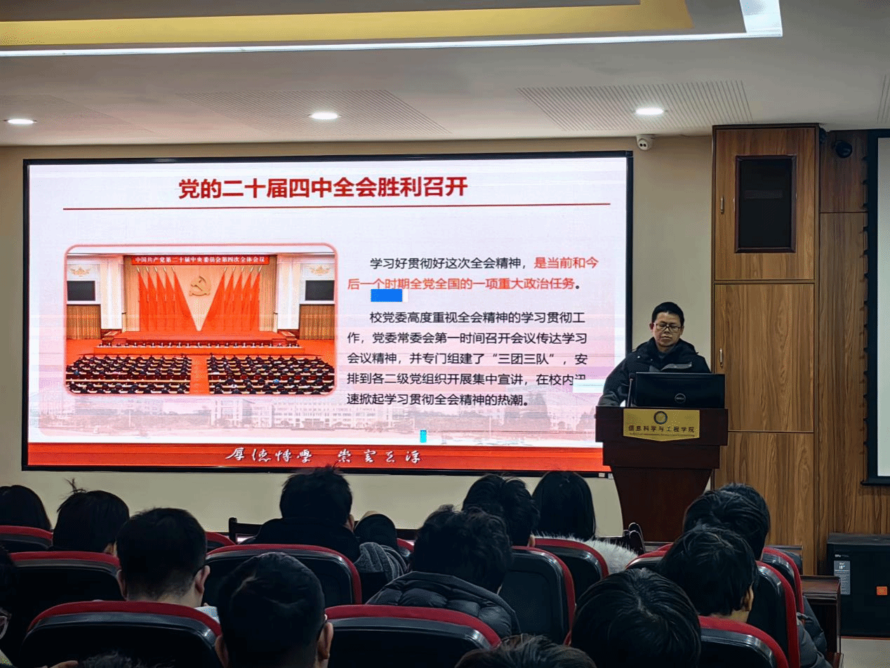 (通讯员谢炜 徐诗亮)为推动干部师生全面学习、全面把握、全面落实党的二十届四中全会精神,12月4日,英国365集团公司“双带头人”专题宣讲会在青山校区教十楼四楼会议室顺利举行。