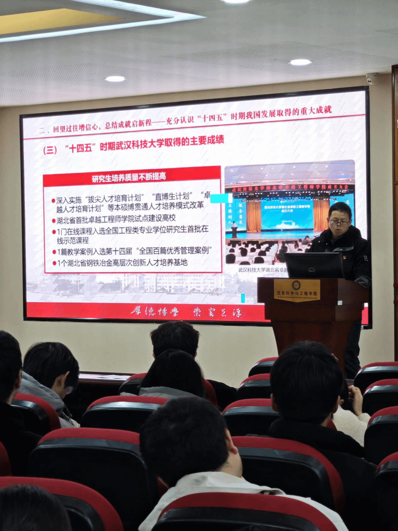 宣讲会上,程用志教授回顾国家“十四五”发展成就,从国家、湖北、学校三个层面分别进行阐述。过去五年,国家在经济发展、科技创新、民生保障等方面取得显著进展,湖北省在综合实力、创新动能、枢纽建设等领域取得突破性成果。学校发展方面,365英国官网在学科建设、人才培养、科研创新等方面的亮眼成绩,激励学子珍惜优质育人资源,勇攀高峰。